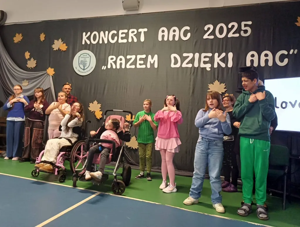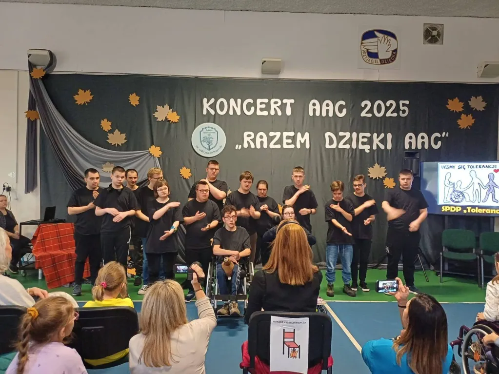 W tym roku obchody Miesiąca AAC, zainspirowane przez Stowarzyszenie „Mówić bez Słów” – ISAAC Polska, pod hasłem: „Innowacje, włączanie, samorzecznictwo. Razem dzięki AAC!”, zakończyliśmy wyjątkowym koncertem, w którym wzięli udział nie tylko użytkownicy AAC, ale również ich rówieśnicy posługujący się mową werbalną, wspierający ich w sytuacjach codziennych. To wydarzenie było symbolem współpracy, wzajemnego zrozumienia i działania na rzecz świata, w którym każdy głos ma znaczenie. Dzisiejsze spotkanie przypomniało wszystkim, że komunikacja to most, który łączy ludzi – niezależnie od sposobu, w jaki się porozumiewają. Było pięknie i wzruszająco.